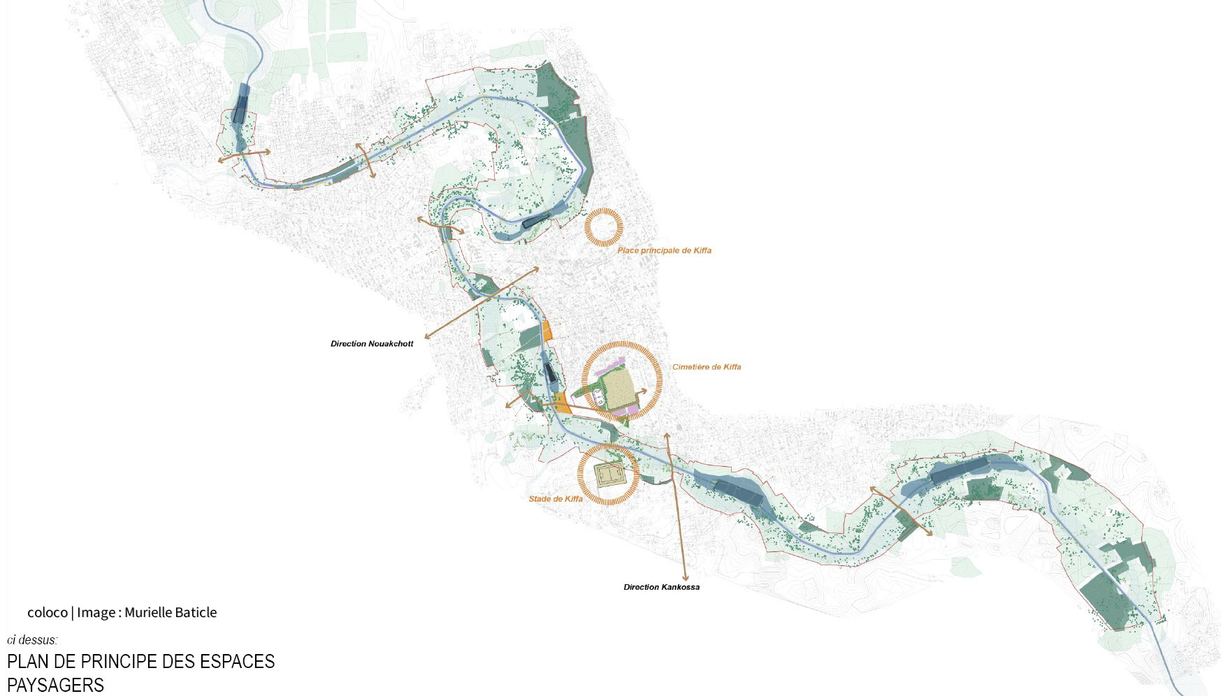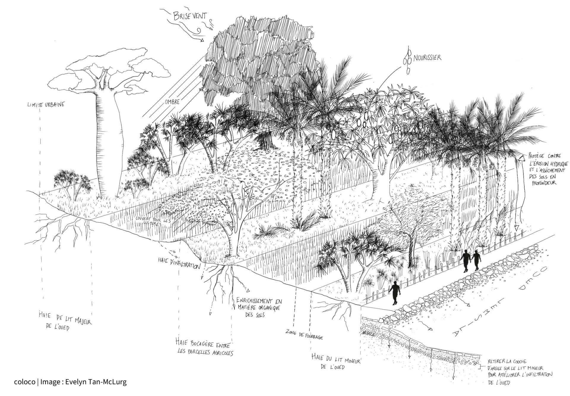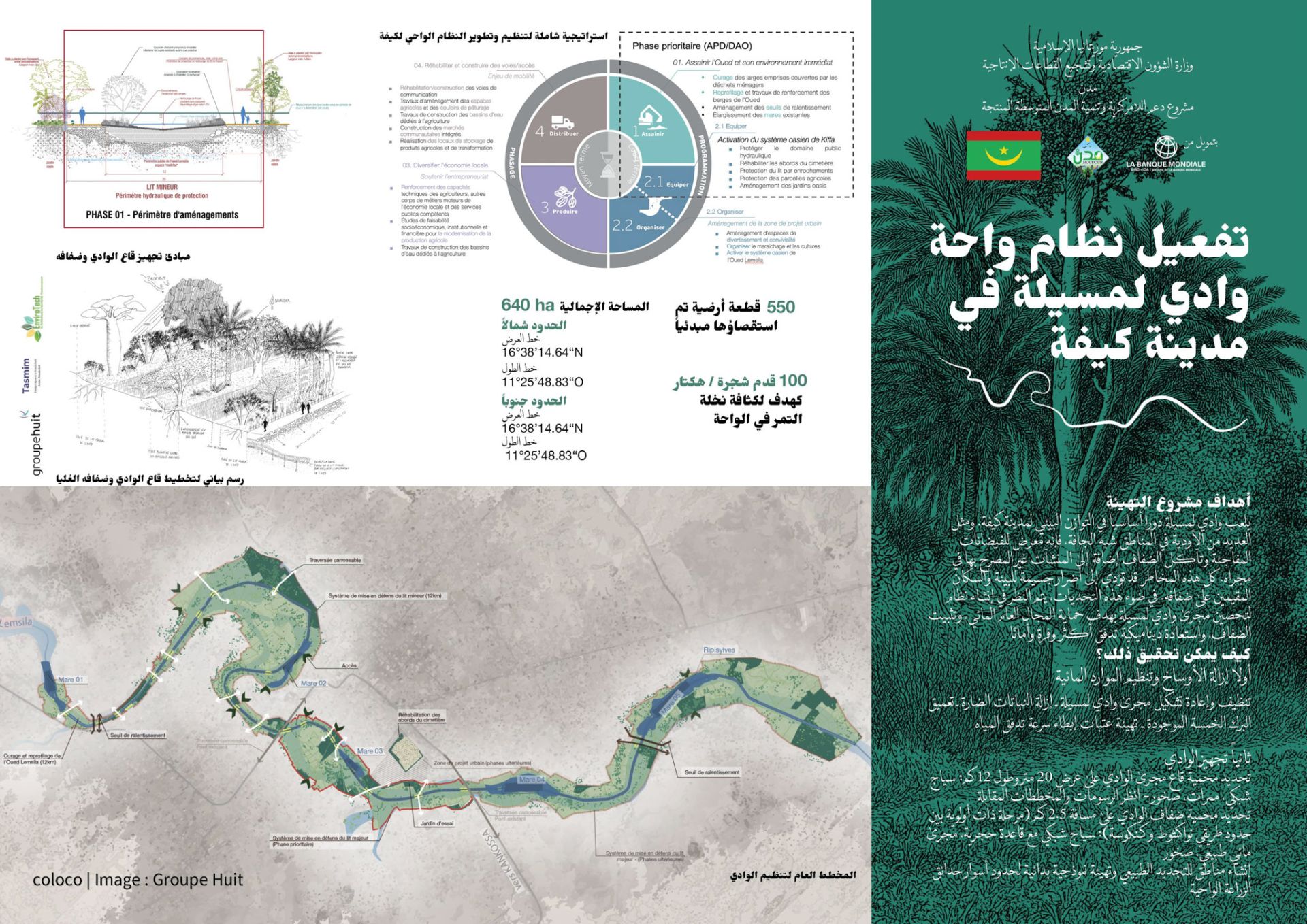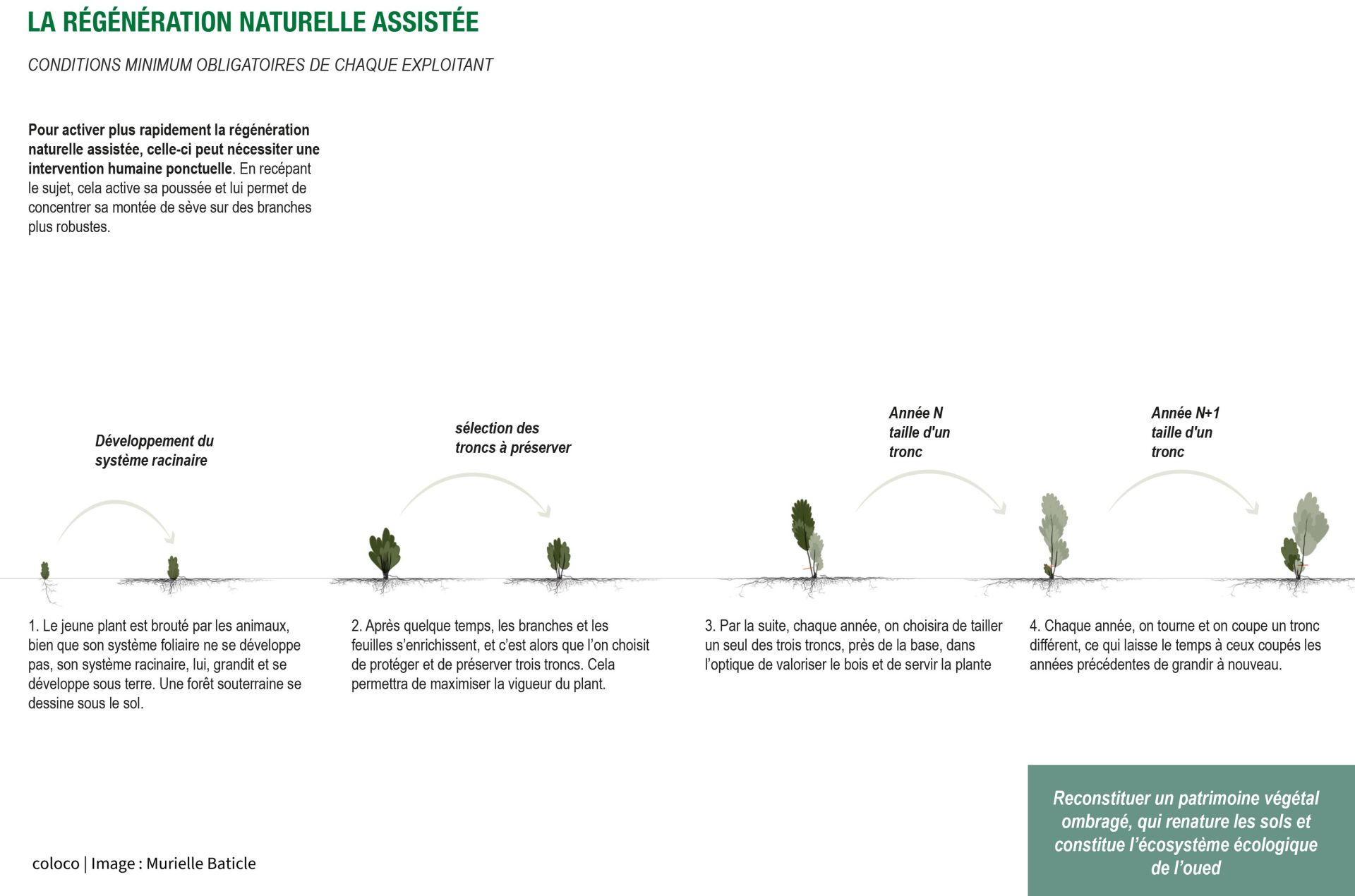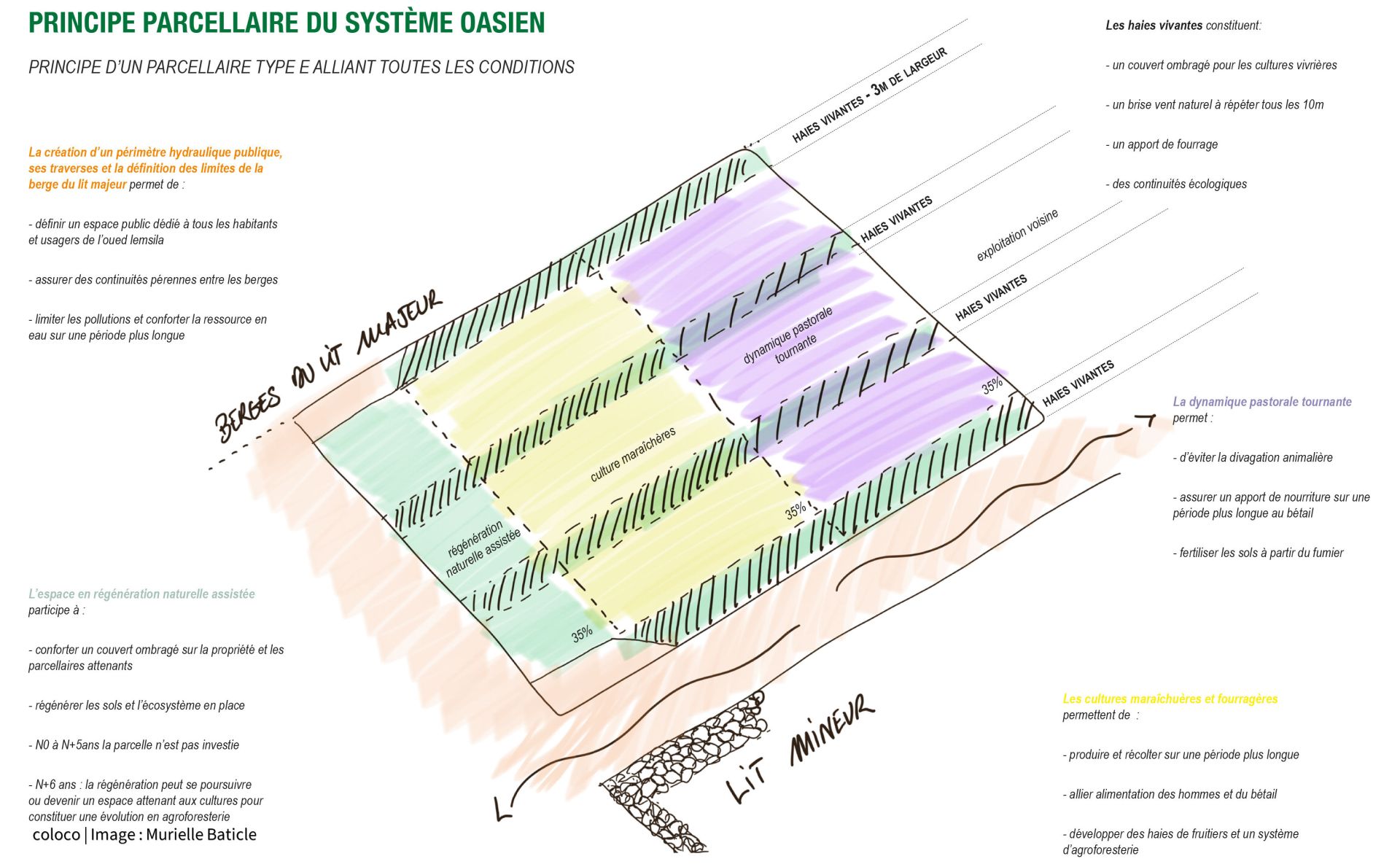 L’ensemble de cette stratégie paysagère permet de restaurer la dynamique oasienne de l’oued. S’appliquant à l’échelle privée comme public, le projet se développe par phases successives dans le cas de sa mise en oeuvre.