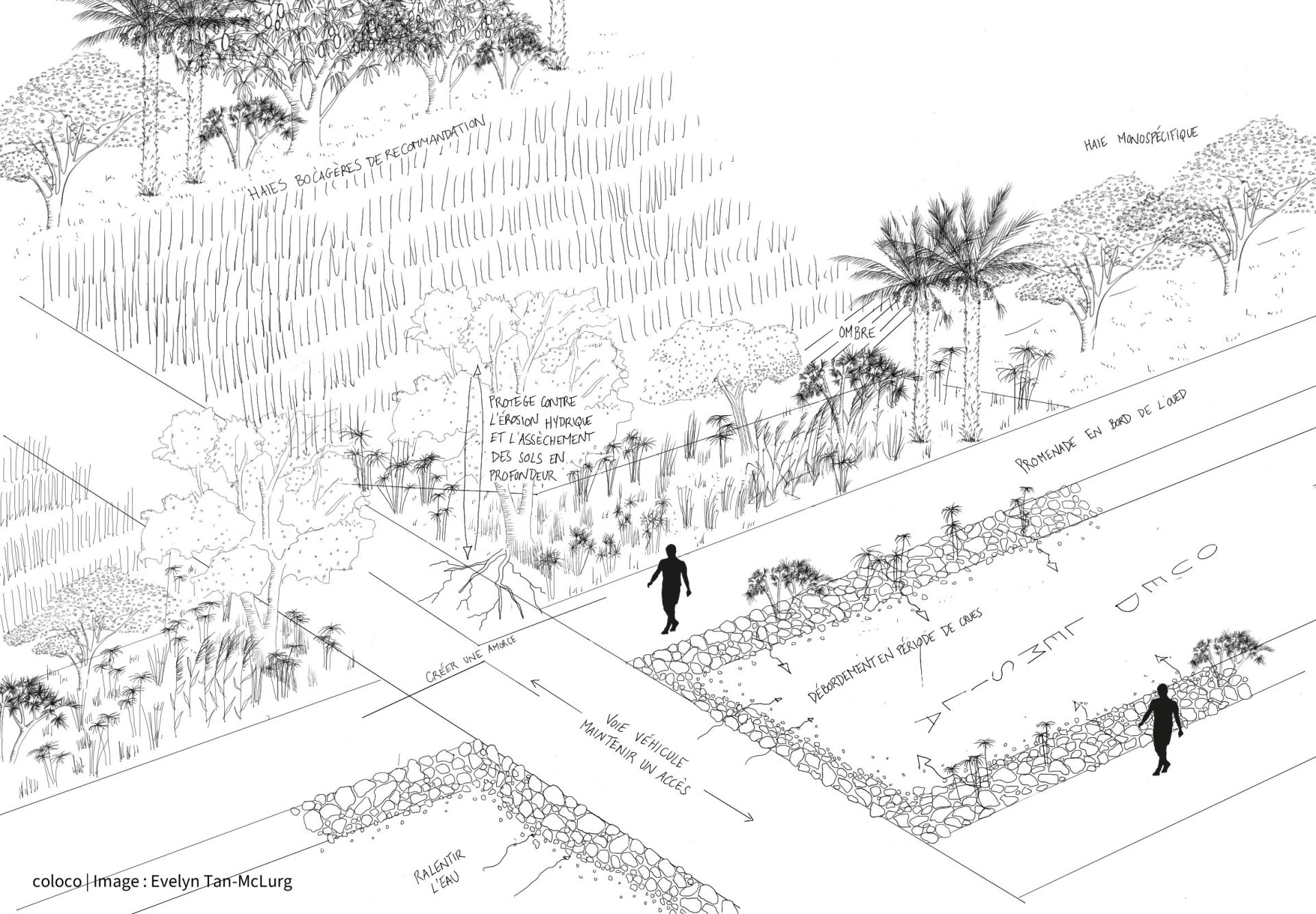 – conforter des zones de renaturaiton, exclue de toute divagation animalère laissant le végétal repousser avec moins de contraintes. Ces zones sont en appuis de bosquets d’arbres et palmiers en place. Clôturées par des limites légères, le régénération assistée peut être mise en oeuvre par la taille sélective