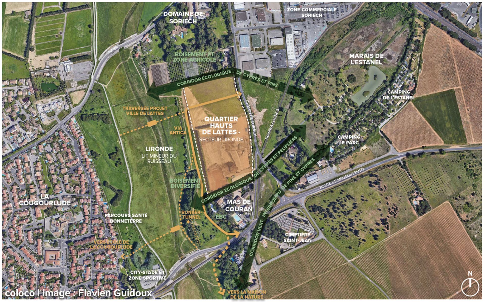 Le quartier des Hauts de Lattes fait l’objet d’un aménagement urbain initié en 2014. Il représente 12ha du périmètre de la ZAC ODE à la Mer. A terme, le quartier résidentiel accueillera plus de 1500 logements dont 700 sur le secteur Lironde. Le contexte du site est caractérisé par la proximité avec les continuités écologiques de la Lironde et le Marais de l’Estanel. Le quartier des Hauts de Lattes souhaite s’inscrire comme maillon de cette armature paysagère existante en préservant le patrimoine naturel en place et en s’ouvrant sur les paysages environnant. Trois axes de projets ont été définis pour développer cette synergie avec le contexte :