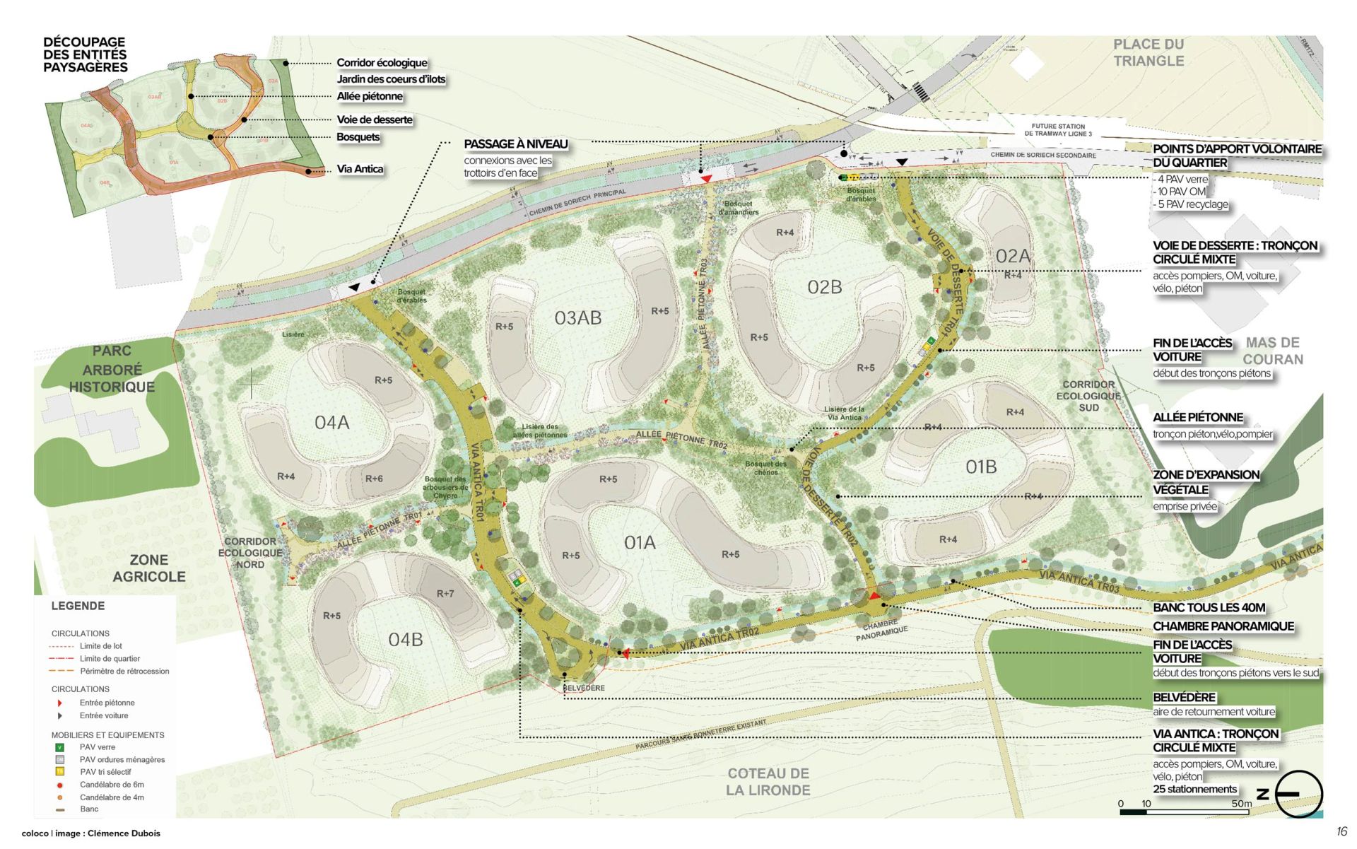 Le projet est en évolution permanente en adaptant les espaces au développement des projets architecturaux. Il va bientôt entrer en chantier de façon à préparer le cadre paysager d’insertion du bâti. C’est un nouveau quartier unique à Montpellier par sa relation avec le paysage, du grand territoire aux aménagements des ilôts.