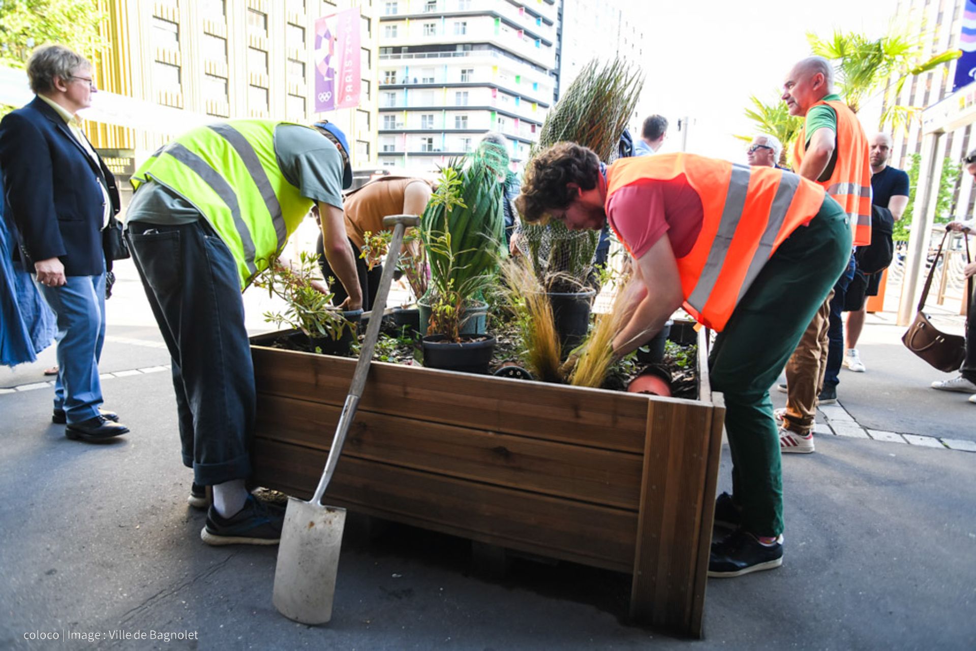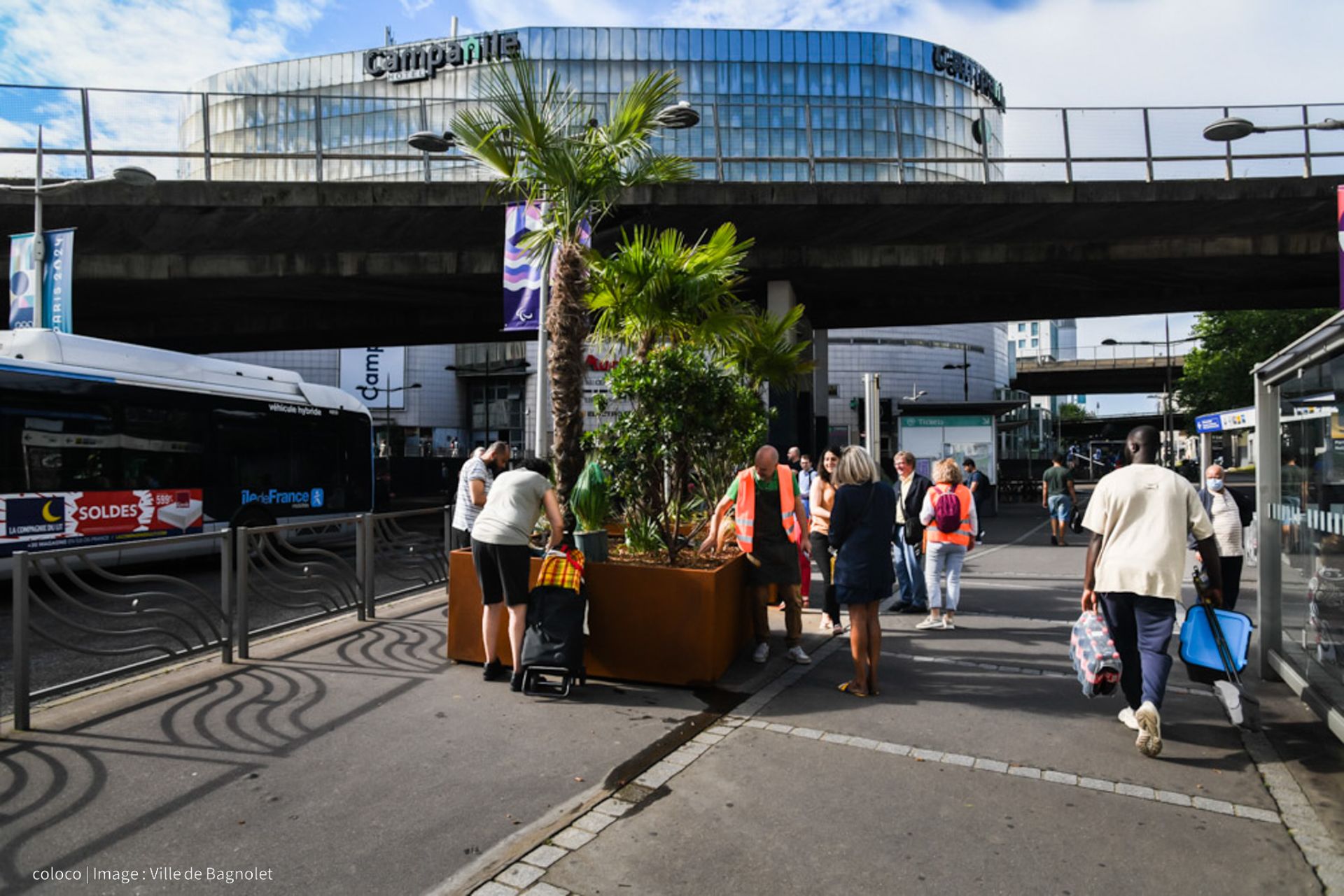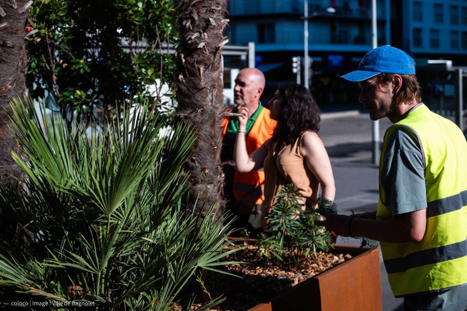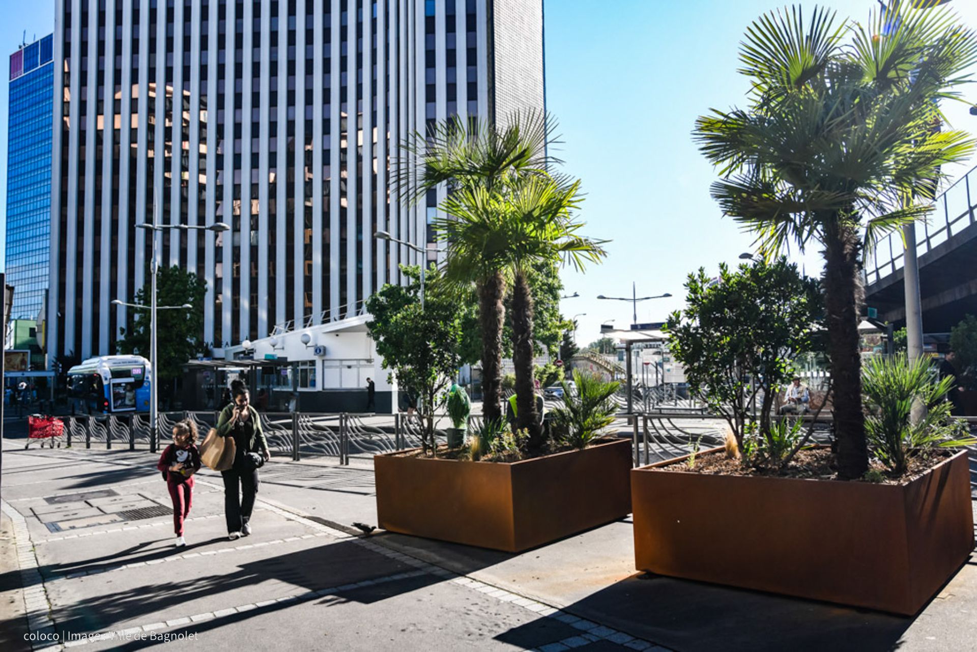 La complexité du sous-sol en place et les usages intenses du site n’ont pas permis une végétalisation massive en pleine terre, des bacs ont alors pris place sur les zones d’attente du pôle multimodal et un espace de plantation en pleine terre a été identifié sur la rue Robespierre dans la continuité du parc des Guilands plus haut.